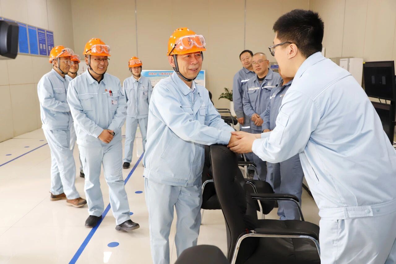 图为周强(右)在热电厂中心控制室向岗位员工亲切问候。